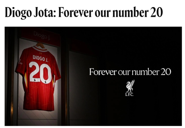 리버풀은 12일(한국시간) 홈페이지를 통해 "등번호 20번은 리버풀의 수많은 승리를 이끈 조타의 자부심과 탁월함이 담긴 번호"라며 "조타는 앞으로 영원히 리버풀의 '20번'으로 기억될 것"이라고 발표했다.