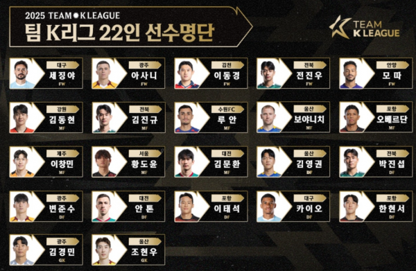 한국프로축구연맹은 팀K리그의 사령탑으로 선정된 울산 김판곤 감독과 코치 역할을 수행하는 광주 이정효 감독이 추가로 발탁한 선수 10명을 합쳐 총 22명의 팀K리그 명단을 확정해 22일 발표했다.