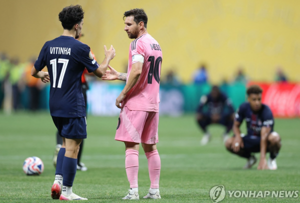 인터 마이애미(미국)의 '슈퍼스타' 리오넬 메시가 경기 중 비티냐(파리 생제르맹)와 볼을 다투다 주먹을 휘두르는 듯한 행동을 해 팬들의 구설에 올랐다.