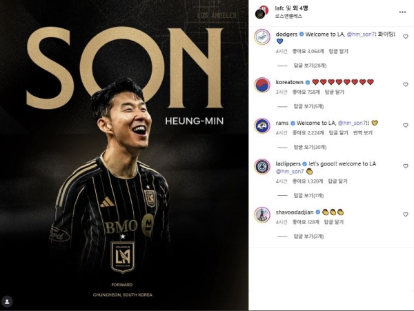 여기에 미국프로농구(NBA) LA 클리퍼스도 손흥민 영입 발표 글에 "레츠 고!! 웰컴 투 LA"라는 댓글을 올렸다.
