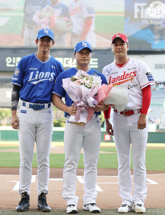 경기장에는 오승환의 상징적인 등장 음악인 넥스트의 ‘라젠카 세이브 어스’가 울려 퍼졌고, SSG 구단은 팬들과 함께 이 자리를 더욱 뜻깊게 만들었다. SSG의 주장 김광현과 삼성 주장 구자욱은 오승환에게 꽃다발을 전달하며 존경의 마음을 표시했다. 이후 양 팀 선수 전체가 그라운드에 함께 서서 기념사진을 남기는 시간도 이어졌다.